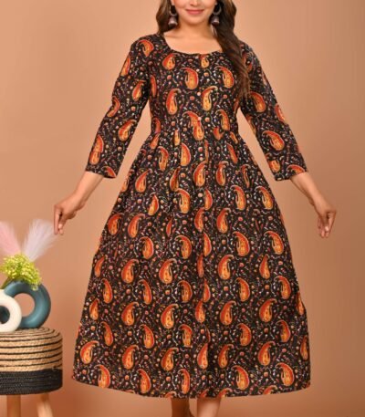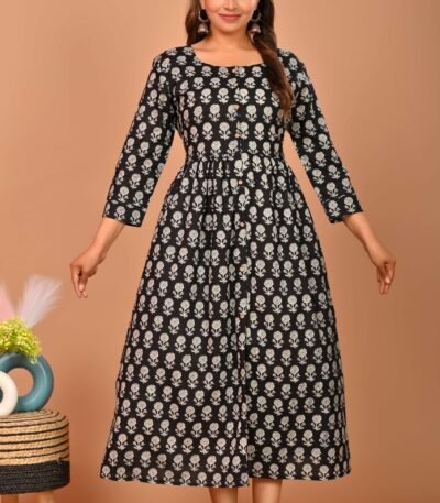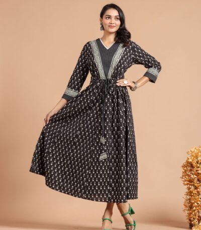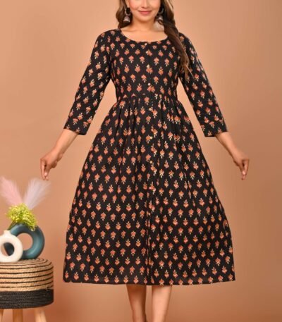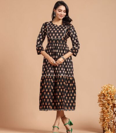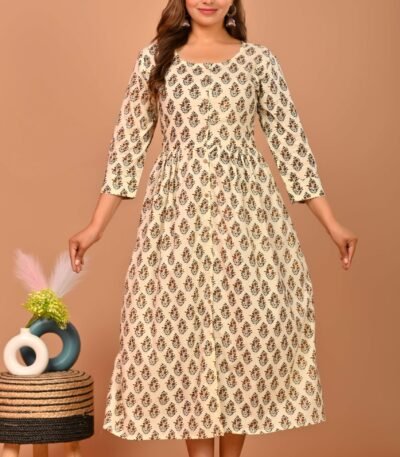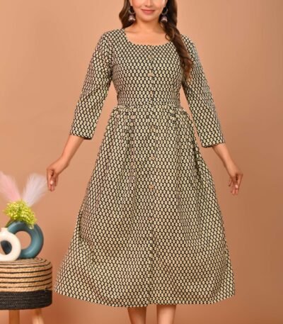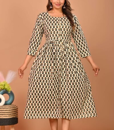 Beige & Black Handblock Printed A-Line Midi Dress with 3/4 Sleeves ? Elegant Ethnic Casual Wear