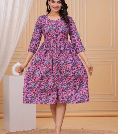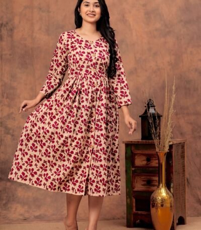 Beige & Red Floral Printed Cotton A-Line Dress with Button-Down Front