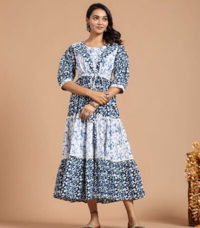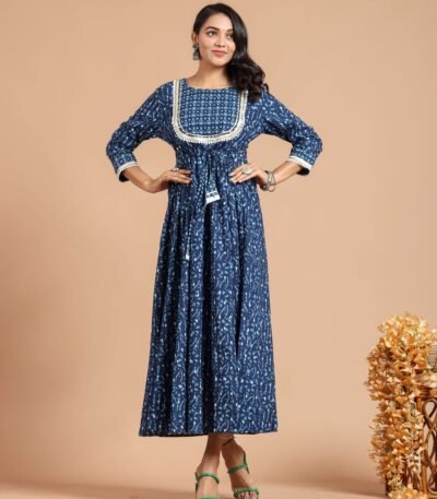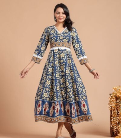Blue Floral Anarkali Maxi Dress with Ethnic Border Detailing