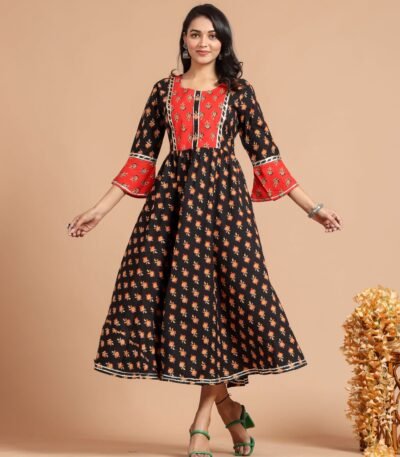 Black Floral Printed A-Line Midi Dress with 3/4th Sleeves ? Elegant Casual & Party Wear