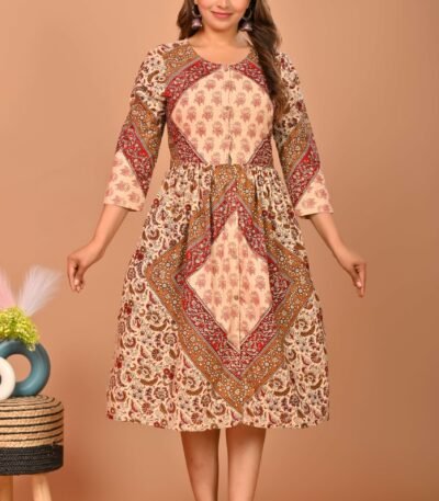 Beige & Red Block Print A-Line Midi Dress with Ethnic Motifs and 3/4 Sleeves ? Festive & Casual Wear