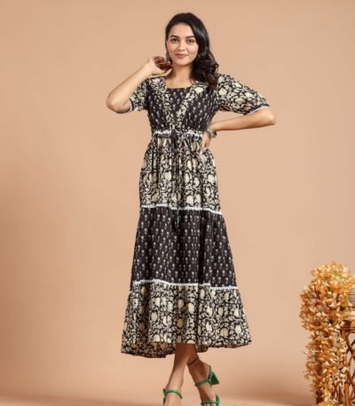 Black & Beige Printed Tiered Maxi Dress with Short Sleeves & Waist Tie ? Ethnic Boho Fusion Wear