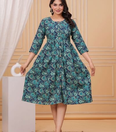 Teal Blue Floral Printed A-Line Midi Dress with Wooden Buttons & 3/4 Sleeves ? Casual & Party Wear