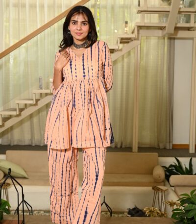 Peach Printed Block Print Cotton Co-ord Set for Women ? Peplum Kurta with Straight Pants