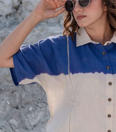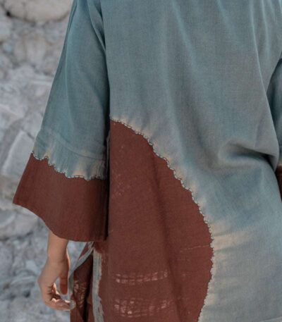 Women’s Cotton Dip-Dye Pattern Two-Piece Lounge Set Tunic with Wide-Leg Pants, Resort Wear ( Navy Blue Beige )