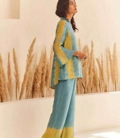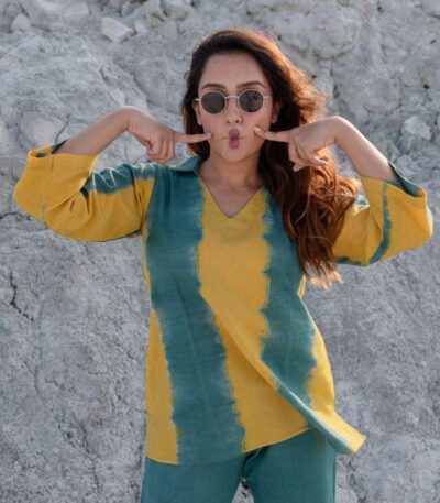 Women’s Cotton Tie Dye Print Two-Piece Lounge Set Button-Down Tunic with Palazzo Pants Resort Wear ( Teal and Yellow )