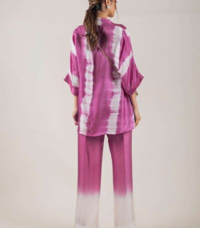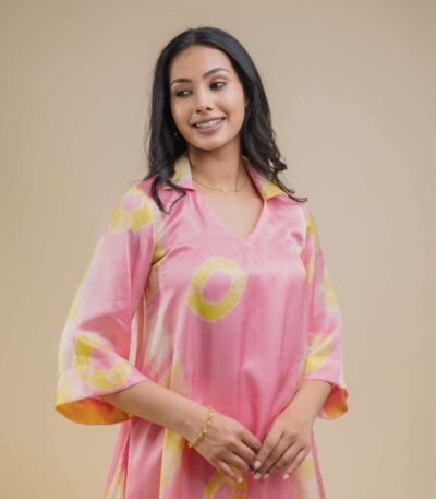 Women’s Cotton Tie Dye Print Two-Piece Lounge Set Button-Down Tunic with Palazzo Pants Resort Wear ( Pink )