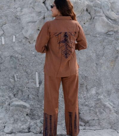 Women’s Cotton Tie Dye Print Two-Piece Lounge Set Button-Down Tunic with Palazzo Pants Resort Wear ( Danim Brown )
