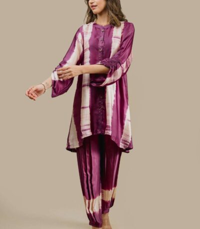Women’s Cotton Tie Dye Print Two-Piece Lounge Set Tunic with Wide-Leg Pants, Resort Wear ( Purple White )