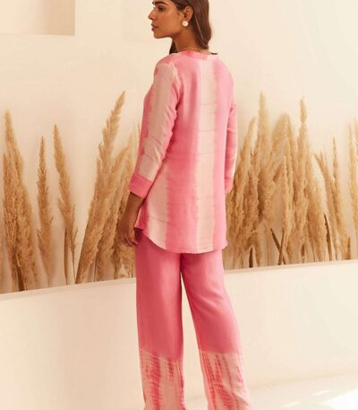 Women’s Cotton Tie Dye Print Two-Piece Lounge Set Tunic with Wide-Leg Pants, Resort Wear ( Pink )