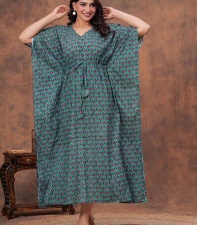Women’s Green Cotton Printed Kaftan Dress with Drawstring Waist