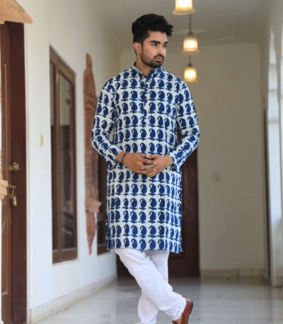 Mens White and Blue Printed Cotton Kurta with White Pajama ? Trendy Festive & Casual Wear