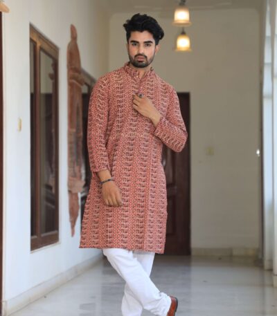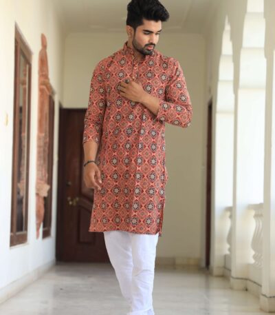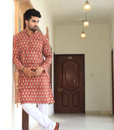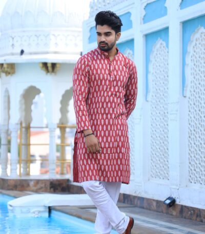 Mens Red Printed Cotton Kurta with White Pajama ? Ethnic Wear for Weddings & Festivals