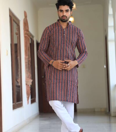 Mens Striped Cotton Kurta in Red & Blue with White Pajama ? Casual & Festive Ethnic Wear