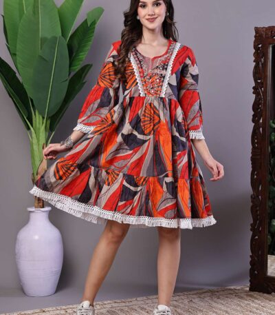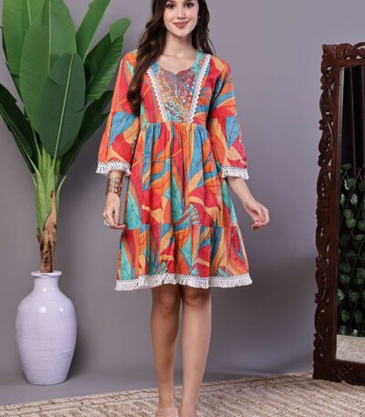 Wome’s Multicolor Printed Cotton A-Line Dress with Embroidered Yoke Midi Dresses
