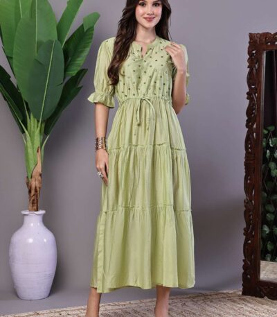 Wome’s Boho-Chic Forest Green Tiered Maxi Dress with Puff Sleeves Dresses