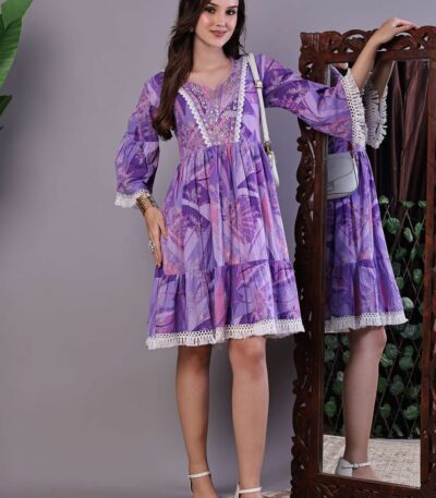 Wome’s Purple Floral Cotton A-Line Dress with Lace Detailing Midi Dresses