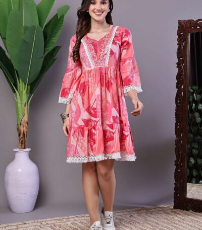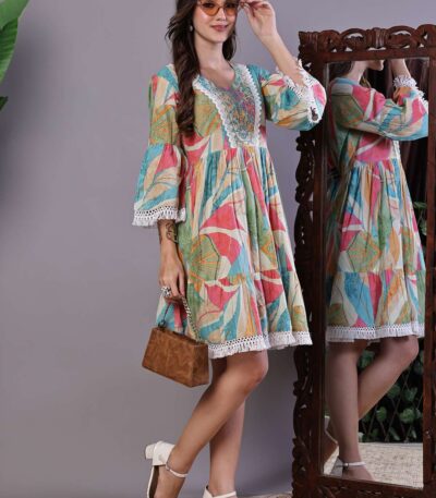Wome’s Vibrant Print Cotton Tunic Dress with Crochet Lace & Three-Quarter Sleeves Midi Dresses