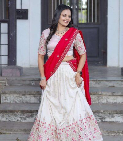 White Vichitra Silk Lehenga Choli with Red Blouse | Sequins & Thread Embroidery | Bridesmaid & Wedding Wear