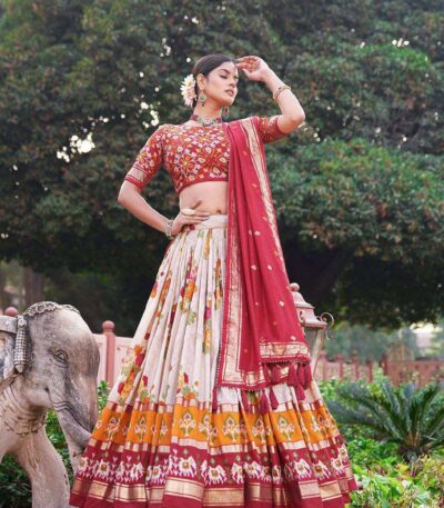 White Tussar Silk Lehenga Choli with Red Blouse | Patola Print & Foil Work | Wedding & Festive Wear