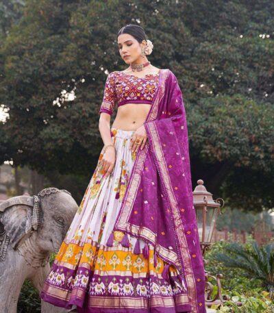 White Tussar Silk Lehenga Choli with Maroon Blouse | Patola Print & Foil Work | Wedding & Festive Wear