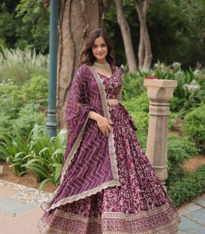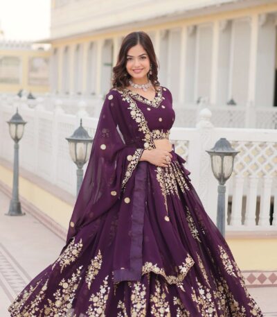 Wine Georgette Lehenga Choli with Sequins Embroidered Dupatta ?