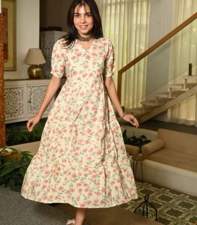 Cream Floral Printed Cotton Anarkali Maxi Dress with Puff Sleeves Elegant Casual Wear