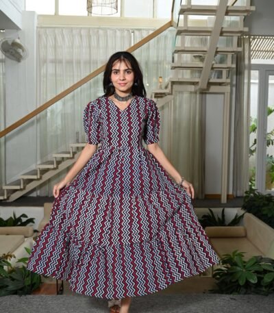 Multi-Color Printed Cotton Anarkali Maxi Dress with Puff Sleeves Elegant Casual Wear