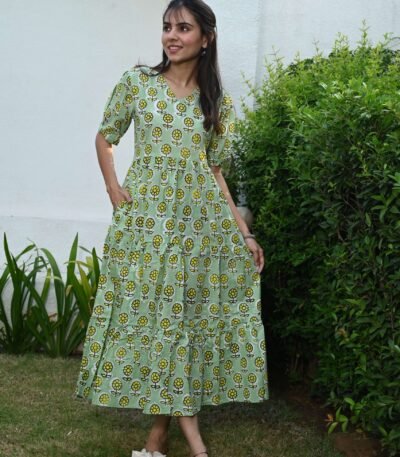 Light Green Floral Printed Cotton Anarkali Maxi Dress with Puff Sleeves Elegant Casual Wear