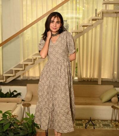 Beige Cotton Anarkali Maxi Dress with Swirl Print & V-Neck Stylish Casual Wear