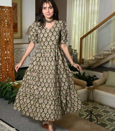Green Floral Printed Cotton Anarkali Maxi Dress with Puff Sleeves Elegant Casual Wear