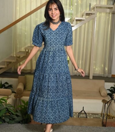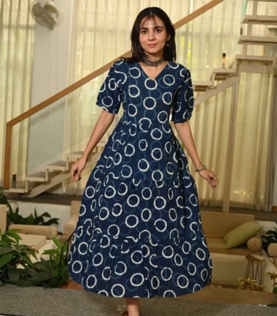 Blue Printed Cotton Anarkali Maxi Dress with Puff Sleeves Elegant Casual Wear