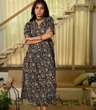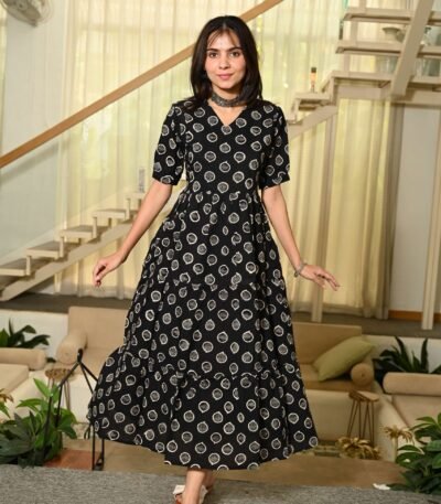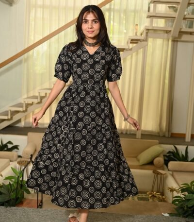 Black Printed Cotton Anarkali Maxi Dress with Puff Sleeves Elegant Casual Wear