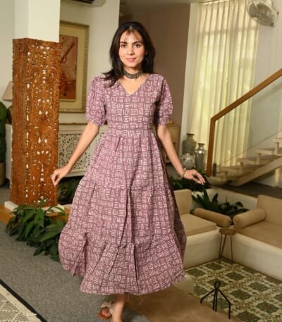 Mouve Printed Cotton Anarkali Maxi Dress with Puff Sleeves Elegant Casual Wear