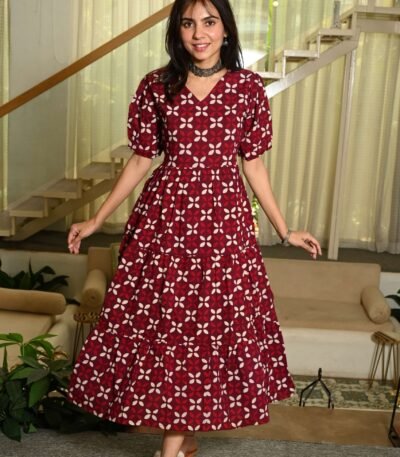 Maroon Printed Cotton Anarkali Maxi Dress with Puff Sleeves Elegant Casual Wear