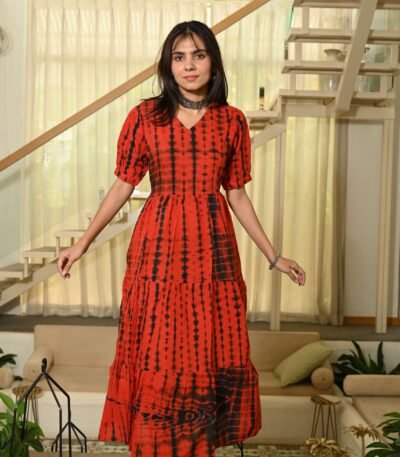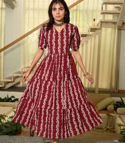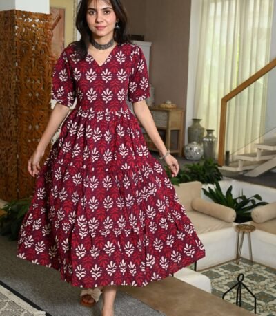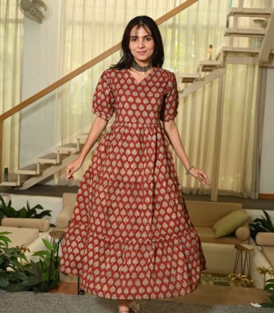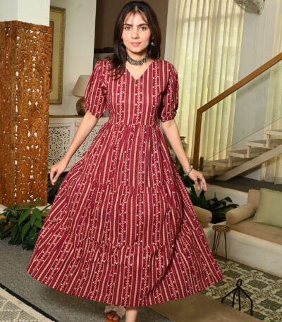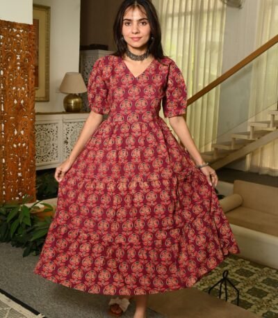 Red Printed Cotton Anarkali Maxi Dress with Puff Sleeves Elegant Casual Wear