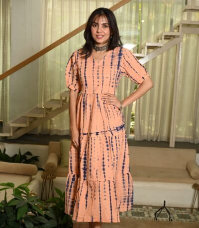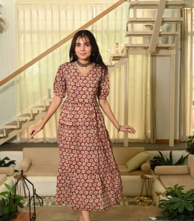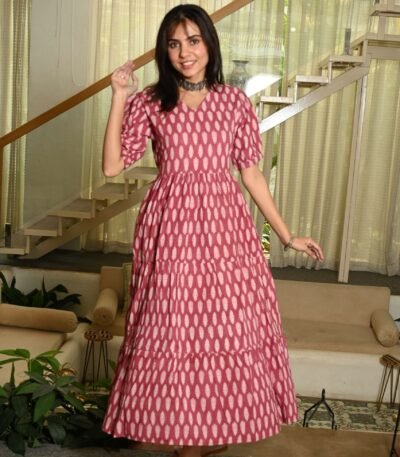 Peach Printed Cotton Anarkali Maxi Dress with Puff Sleeves Elegant Casual Wear