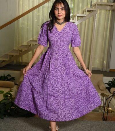 Purple Printed Cotton Anarkali Maxi Dress with Puff Sleeves Elegant Casual Wear