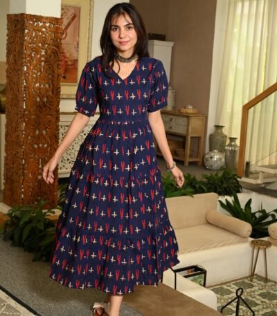 Navy-Blue Printed Cotton Anarkali Maxi Dress with Puff Sleeves Elegant Casual Wear