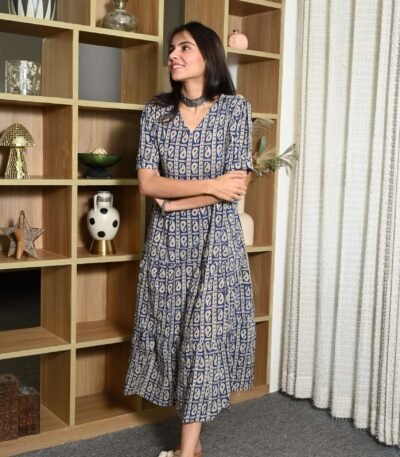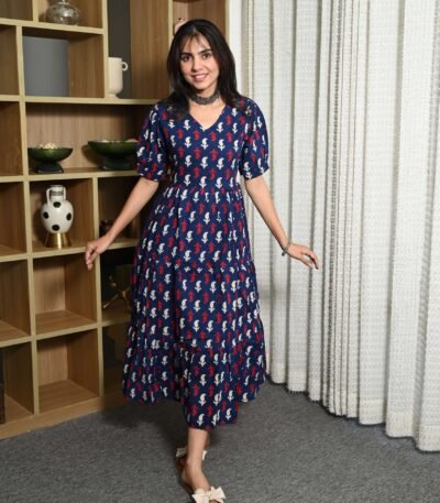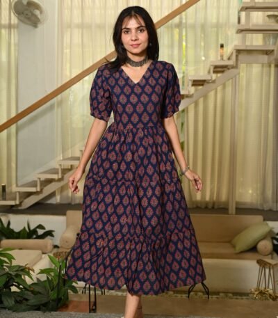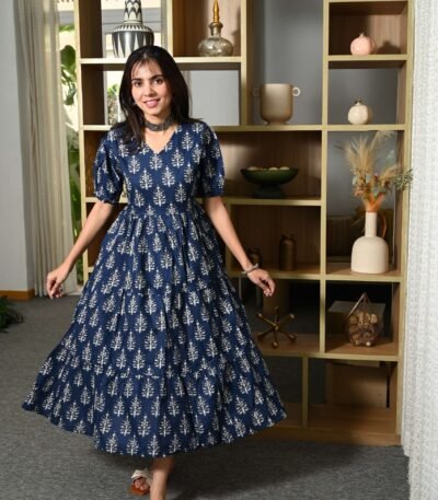 Navy Blue Printed Cotton Anarkali Maxi Dress with Puff Sleeves Elegant Casual Wear
