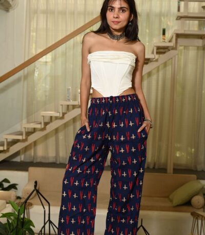 Navy Blue Printed Cotton Pants for Women ? Relaxed Fit with Pockets & Elastic Waist