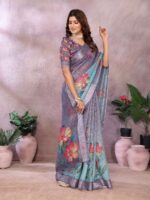 Wrap yourself in refreshing elegance with this Aqua Blue Floral Printed Saree. Made from a lightweight and luxurious linen shimmer fabric, this saree drapes beautifully and feels comfortable all day long. The serene aqua blue base is brought to life with large, vibrant floral prints in striking shades of red, pink, and yellow, creating a bold yet graceful look.