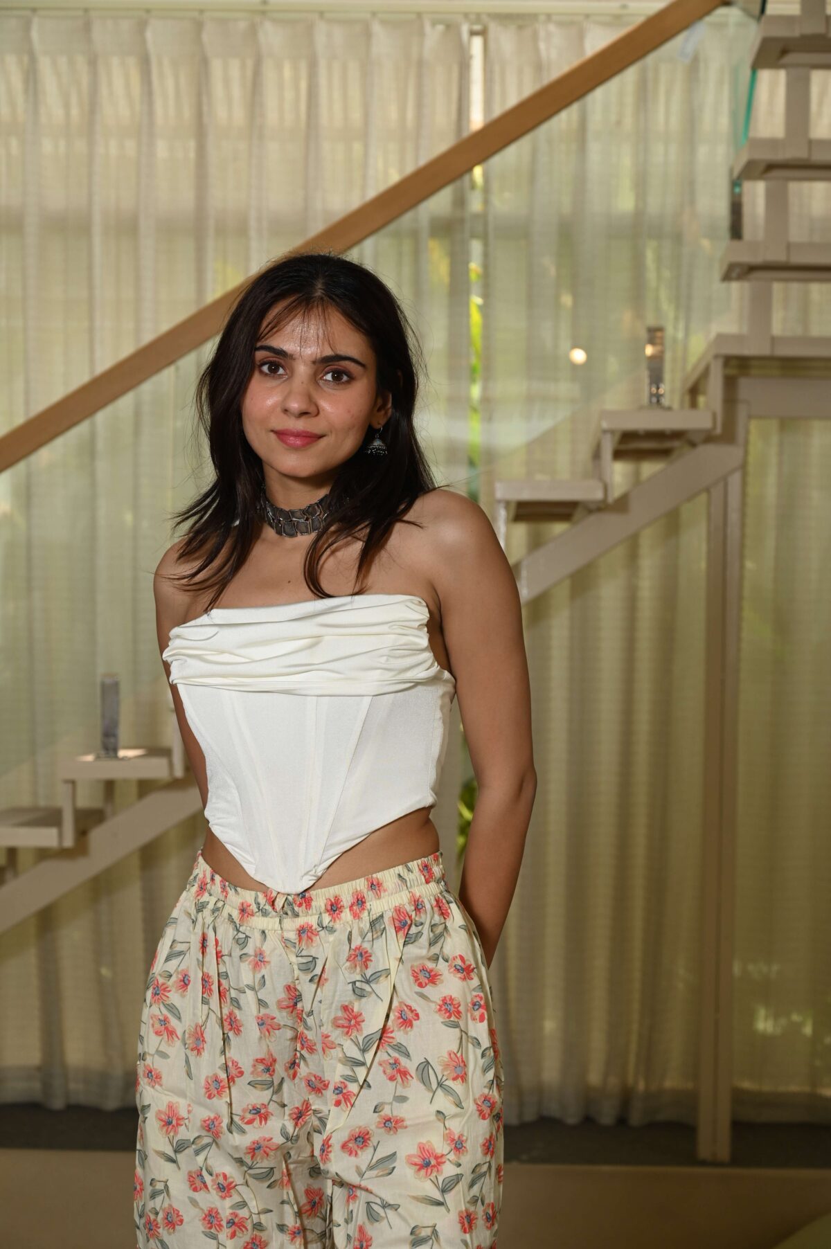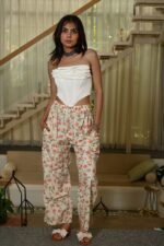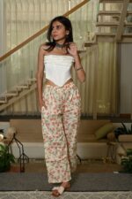 beige cotton floral printed straight pants for women, featuring soft pink and green floral motifs that add a touch of elegance to everyday wear. Crafted from breathable cotton, these pants offer a relaxed fit with an elastic waistband for all-day comfort. The addition of practical side pockets makes them both stylish and functional. Pair them with kurtas for a traditional vibe or crop tops and shirts for a modern casual look.
