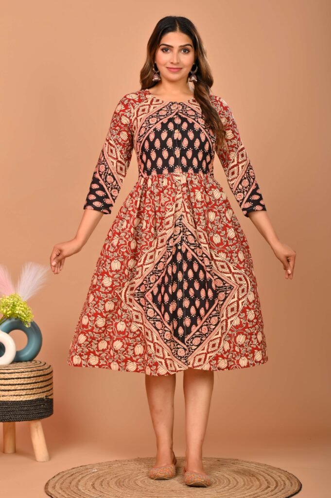 Beige & Red Block Print A-Line Midi Dress with Ethnic Motifs and 3/4 Sleeves ? Festive & Casual Wear