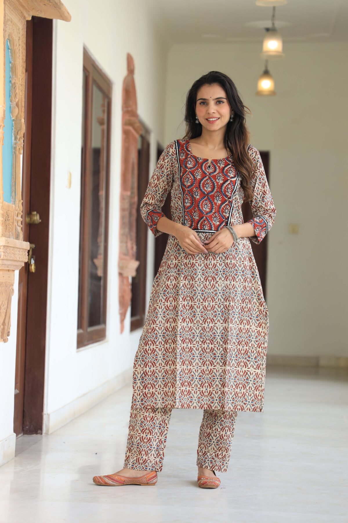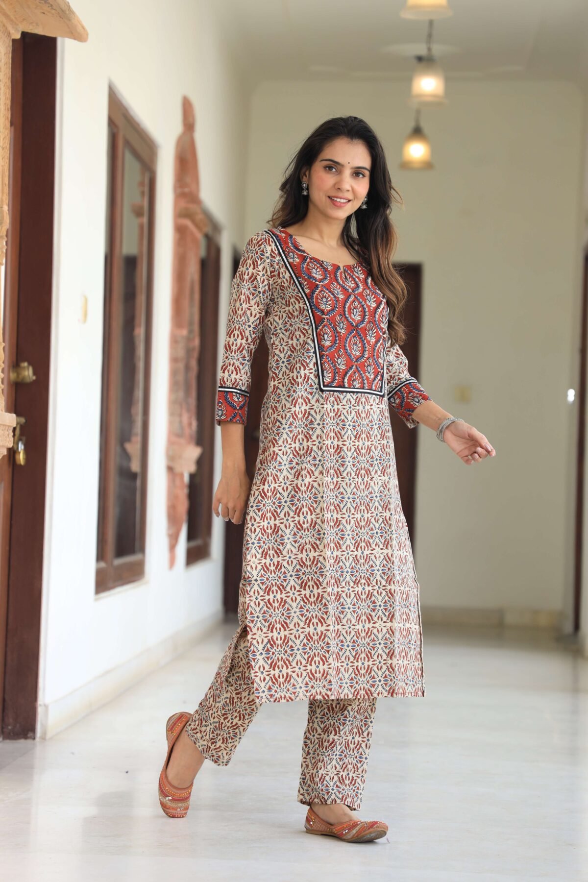 beige and red printed cotton kurta set, designed for a perfect blend of tradition and modern style. The kurta showcases a striking contrast yoke with red floral patterns bordered in black, adding a bold yet classy touch. The beige base is adorned with delicate floral-inspired motifs, complemented by 3/4th sleeves featuring coordinated print details. Paired with matching straight-cut pants, this set ensures both elegance and comfort.