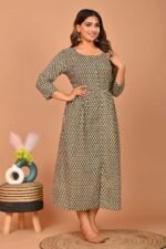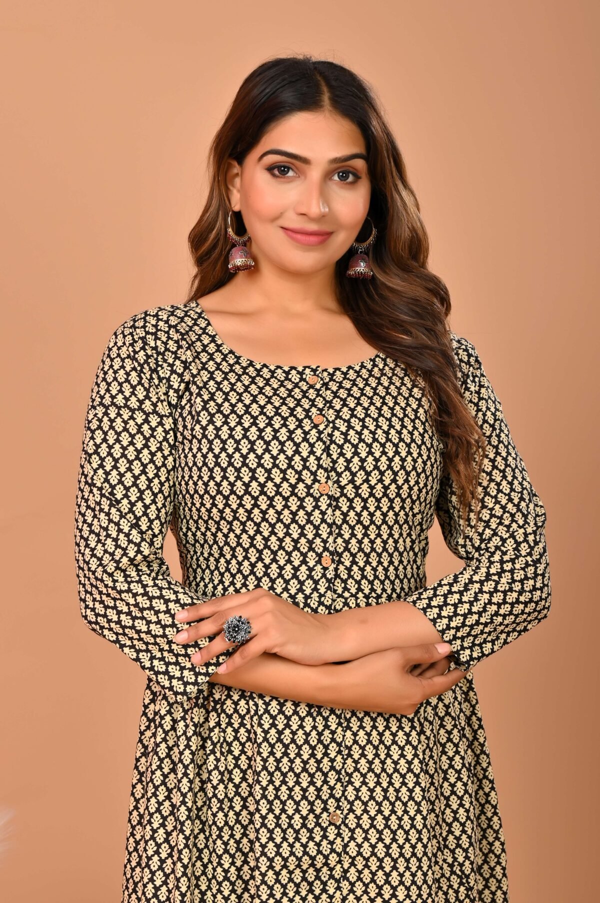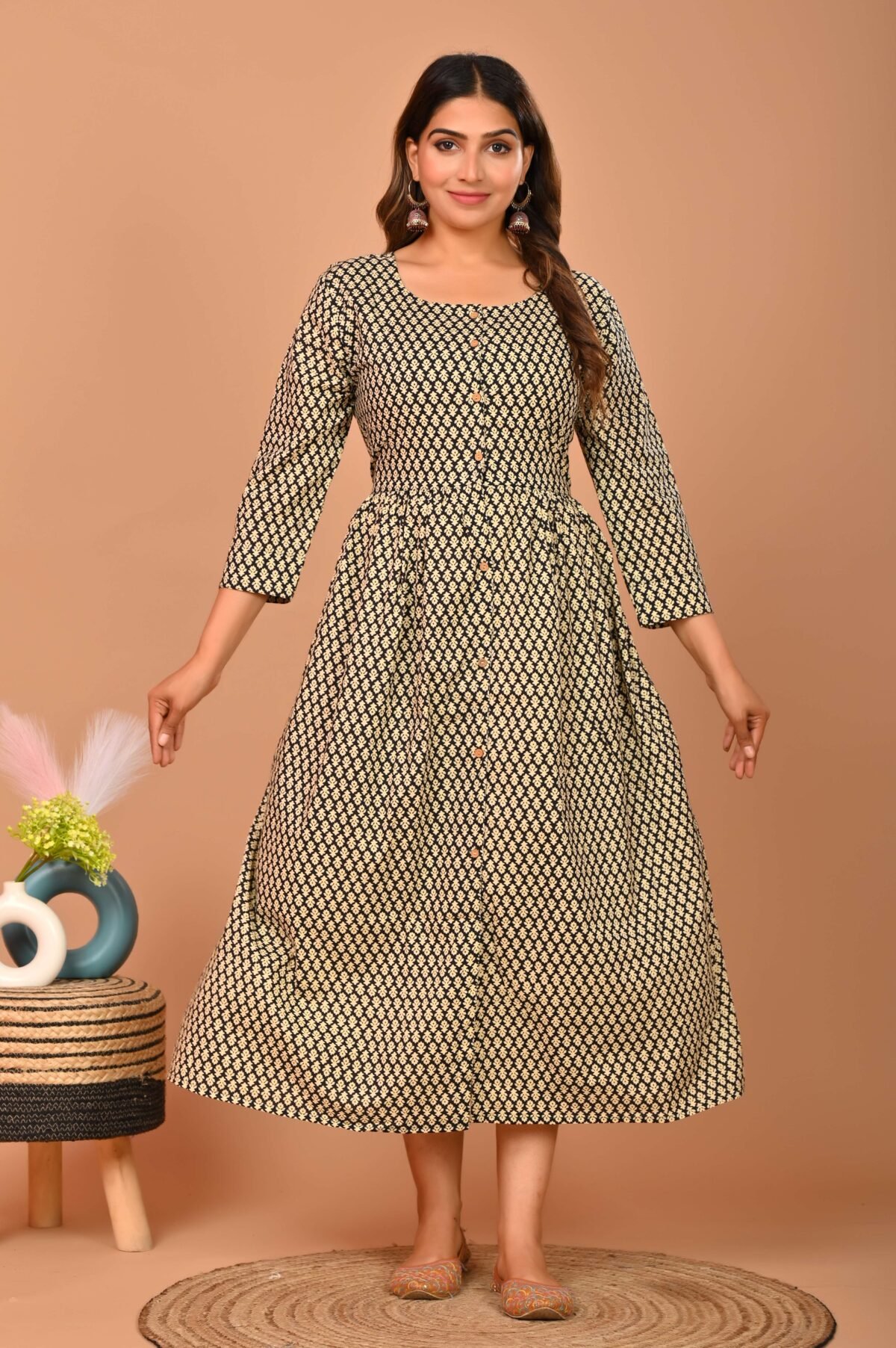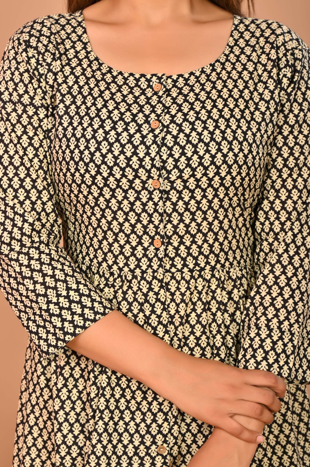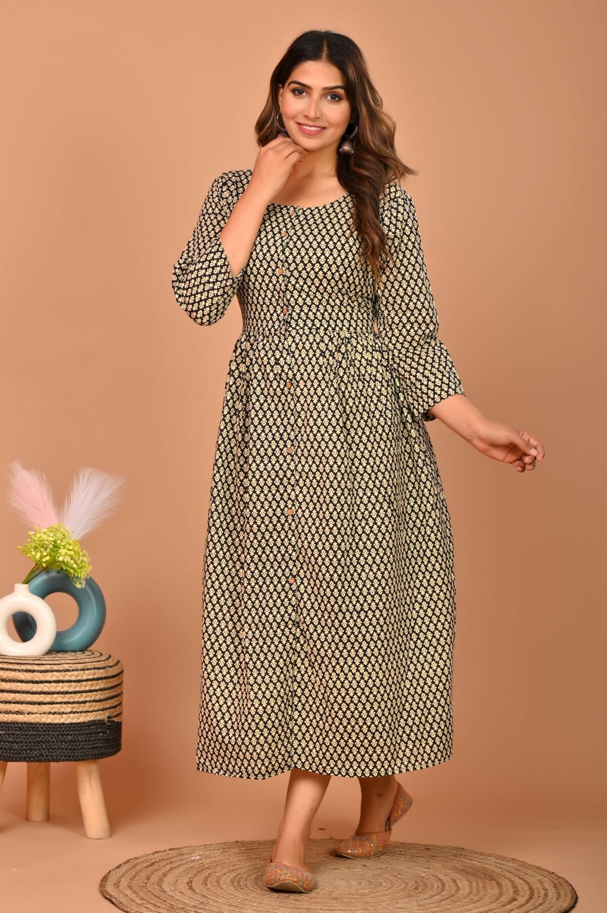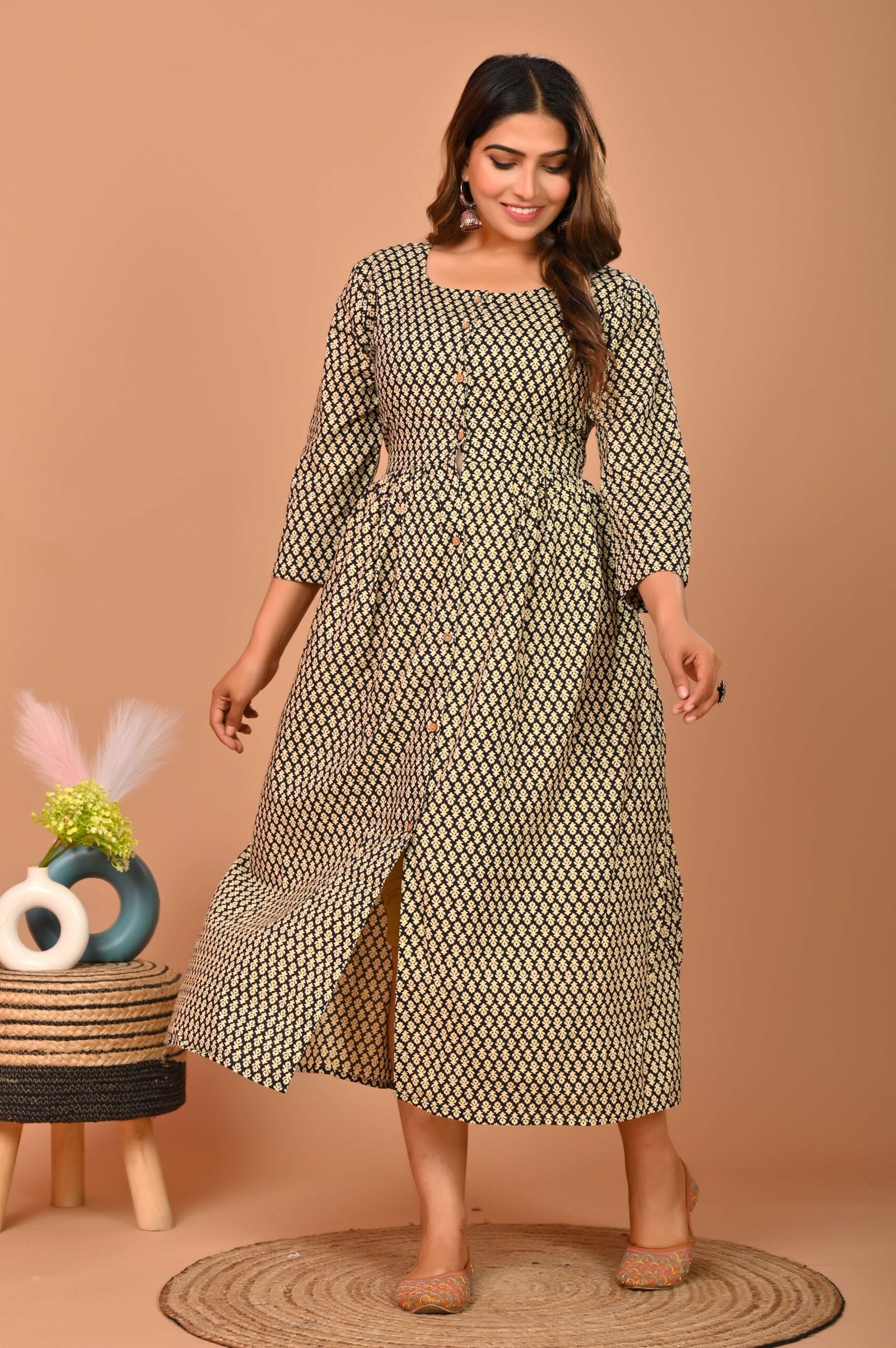 Effortless elegance with our Floral Printed A-Line Midi Dress, designed to keep you stylish and comfortable all day long. Crafted from premium breathable fabric, this dress features a timeless A-line silhouette that flatters every body type. The vibrant floral print on a classic black base adds a touch of charm, making it perfect for both daytime outings and evening gatherings.