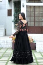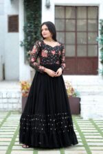 Add a touch of sophistication to your festive wardrobe with this exquisite Faux Blooming designer gown. Designed with intricate multi-thread embroidery and sequins detailing, the gown reflects a perfect balance of modern charm and traditional craftsmanship. Its fancy V-neck and full sleeves add an elegant finish, making it a versatile outfit for every special occasion.