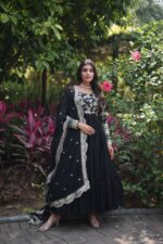 Featuring a fancy round neck, full sleeves, and a 12-meter flowing flair with frill stitching, the gown flatters all body types while ensuring comfort with soft cotton full-length lining. The matching Faux Blooming dupatta is richly embellished with sequins cutwork, adding a sophisticated finishing touch to the ensemble.