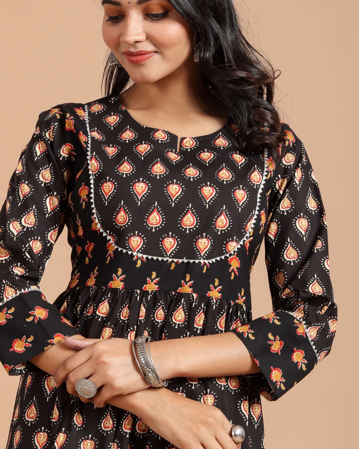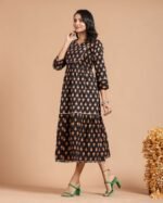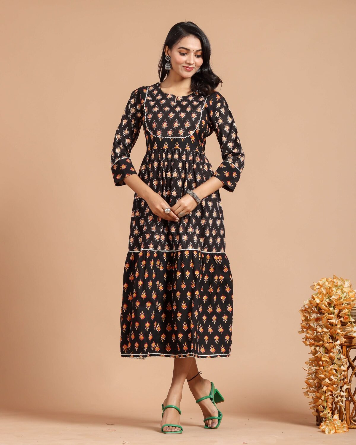 Effortless elegance with our Floral Printed A-Line Midi Dress, designed to keep you stylish and comfortable all day long. Crafted from premium breathable fabric, this dress features a timeless A-line silhouette that flatters every body type. The vibrant floral print on a classic black base adds a touch of charm, making it perfect for both daytime outings and evening gatherings.