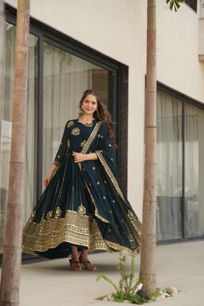 Features a 3-layer frill stitch with a fancy front and back neck design, creating a graceful and stylish look.